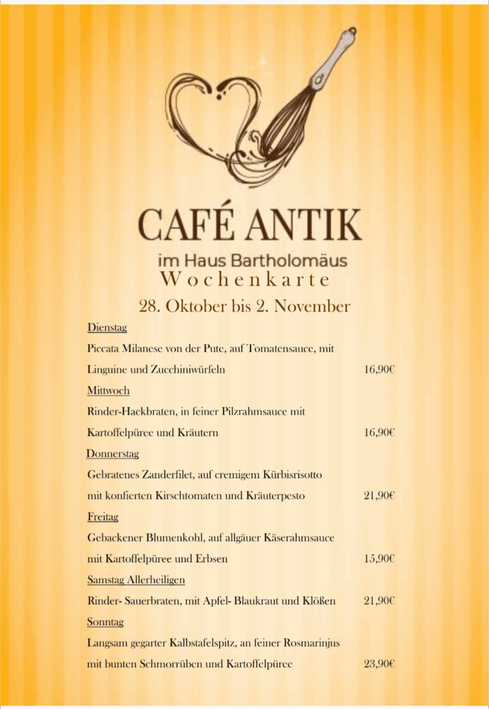 Wir bieten täglich wechselnde Tagesgerichte, die wir frisch zubereiten, eine kleine Speisekarte finden sie bei uns auch vor. Unsere Kuchen sind alle frisch und hausgebacken.