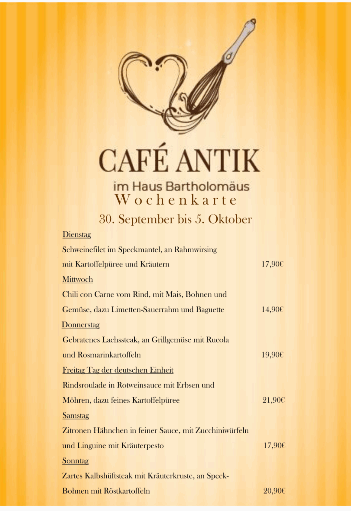 Wir bieten täglich wechselnde Tagesgerichte, die wir frisch zubereiten, eine kleine Speisekarte finden sie bei uns auch vor. Unsere Kuchen sind alle frisch und hausgebacken.